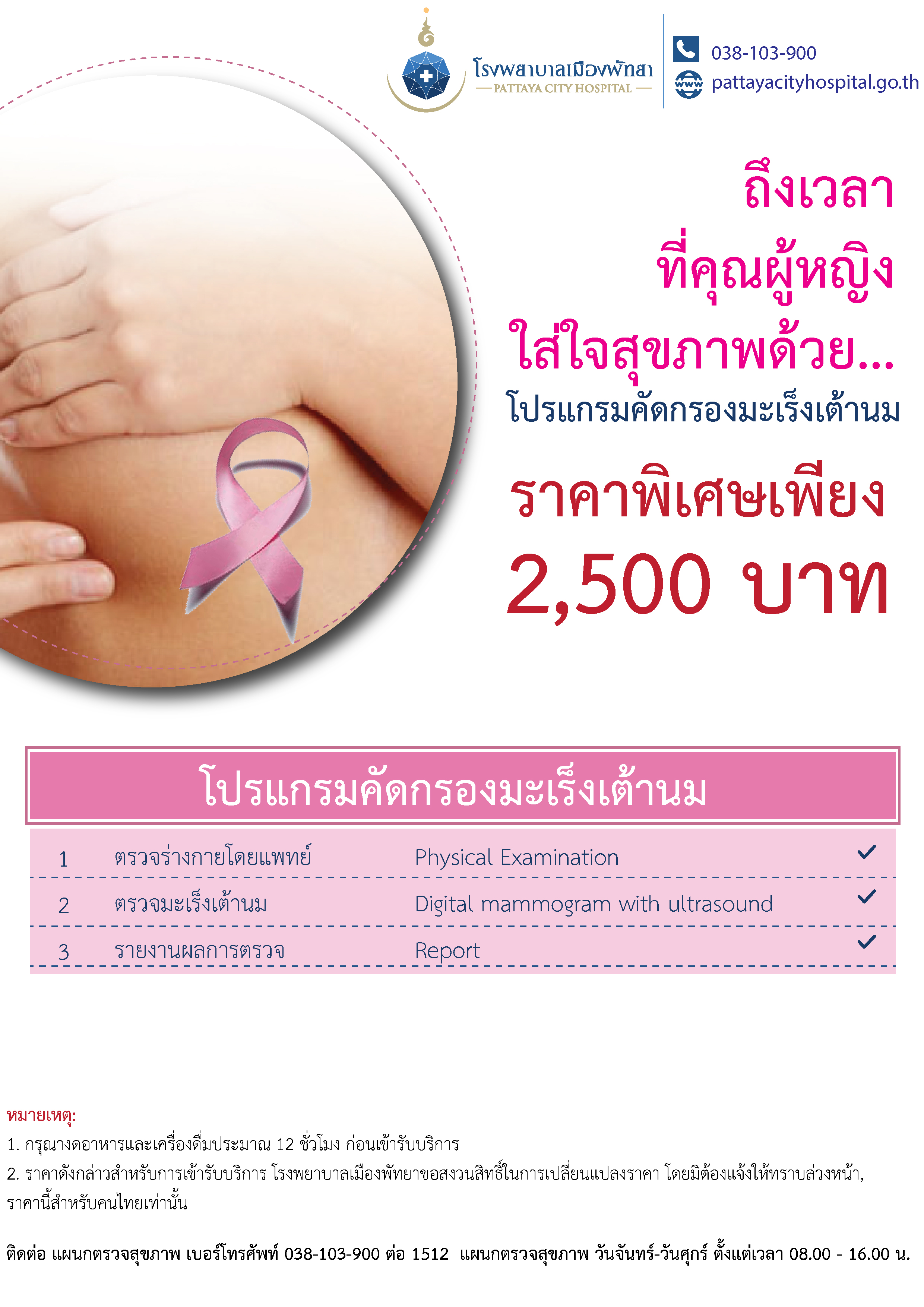 โปรแกรมตรวจคัดกรองมะเร็งเต้านม | ราคาเริ่มต้น 2,500 บาท |
